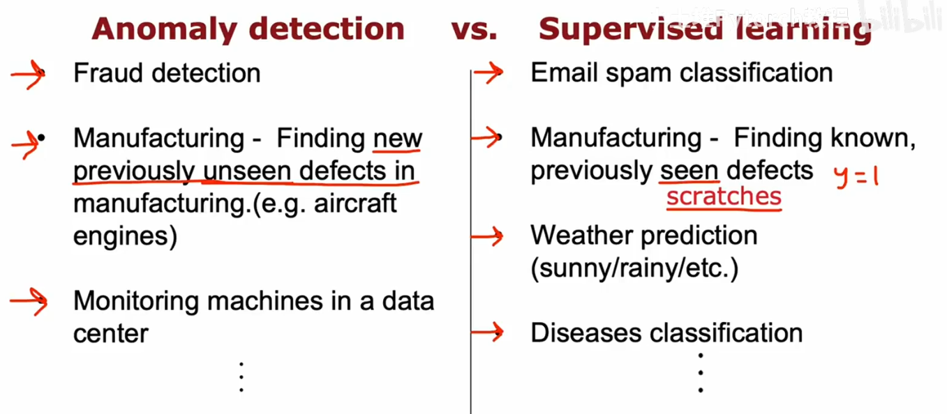 - 当我们只有少量正样本和相对大量的负样本时,异常检测算法通常是更合适的选择,我们可以使用负样本来构建p(x)模型,模型参数只从负样本中学习得到