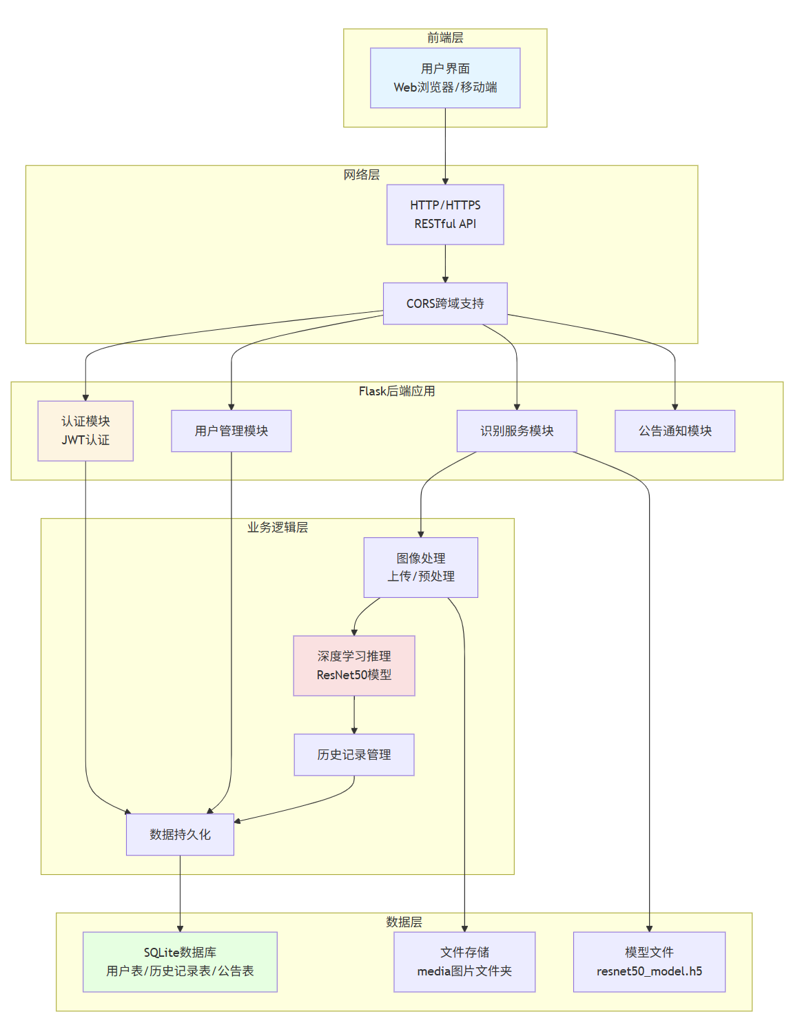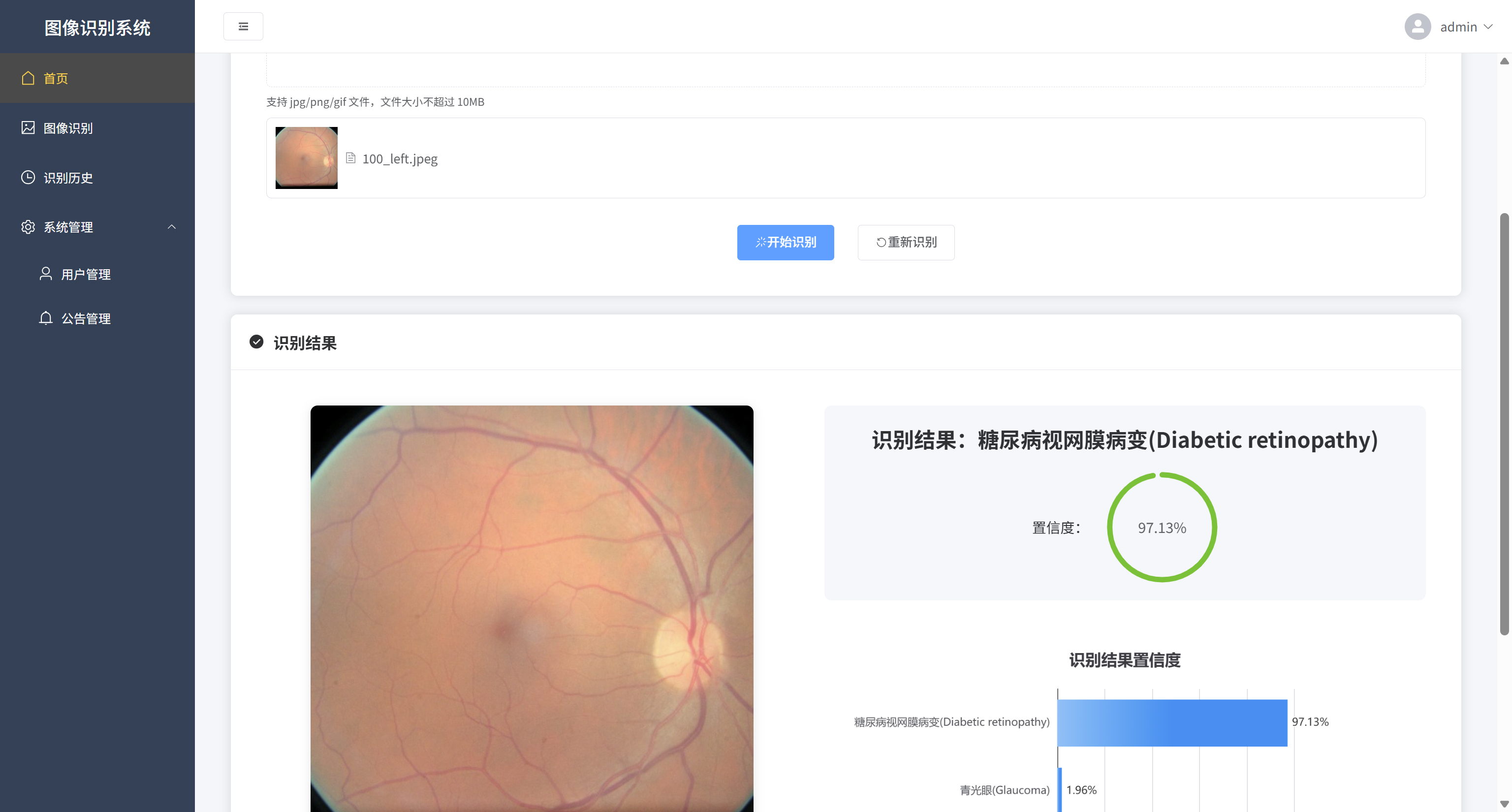 本项目是一款基于深度学习的眼疾智能识别Web项目,旨在为用户提供快速、准确的眼部疾病辅助诊断服务研究。系统采用Python Flask作为后端框架,结合TensorFlow深度学习框架,基于ResNet50预训练模型实现了对白内障、糖尿病视网膜病变、青光眼等常见眼疾的自动识别。用户只需上传眼部图像,系统即可在短时间内返回识别结果,包括疾病类型、置信度以及所有可能类别的预测概率。系统还集成了完善的用户认证机制,支持用户注册、登录功能,并记录所有识别历史,方便用户随时查询和管理。整个系统采用RESTful API设计,具有良好的扩展性和跨平台兼容性。