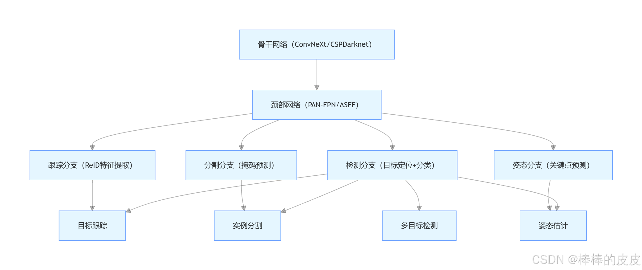 YOLO 的拓展本质是在检测头基础上增加任务分支 ,共享骨干网络与颈部网络的特征提取能力,实现「一模型多任务」。核心架构逻辑如下: