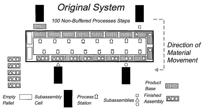 在原始系统设计中,产品基座在左上方的子装配单元(黑色矩形)中组装。它被固定在托盘上,并在主环线上顺时针移动,同时执行各种操作。第一个子装配单元在右上方添加。在进行其他操作并添加更多子装配件后,完成的打印机构从托盘上分离下来。托盘留在系统中,而完成的组件被向下游移动。主环路包含30个自动化工作站。每个子装配单元完成的工作量大约相当于四个主环路工作站。系统设计中基本没有在制品库存空间。