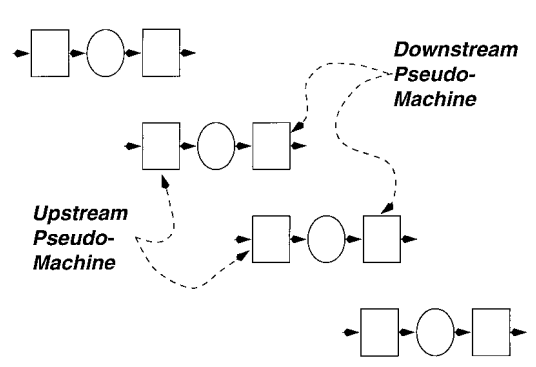 同步模型生产线的分解 图3显示了一个五台机器、四个缓冲区的生产线。对于一个所有机器具有恒定且相等的操作时间,并且修复和故障时间呈几何分布的系统,Gershwin [1987] 表明,生产率和平均在制品库存可以通过一组两台机器的生产线来近似表示(见图4)。