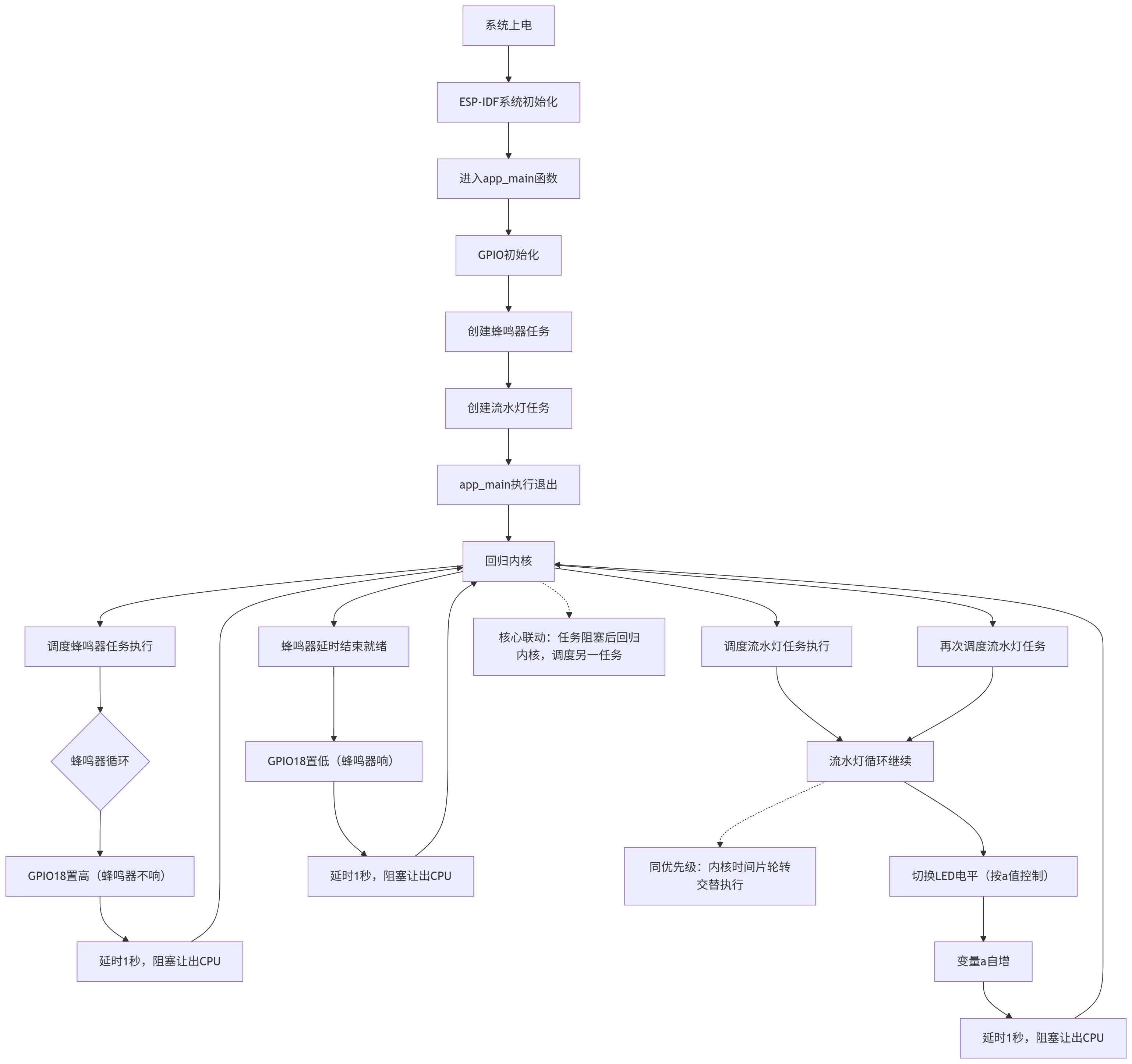 在FreeRTOS中,app_main()函数知识任务创建入口,执行完创建任务的代码后就会退出,真正的业务逻辑在两个任务中。