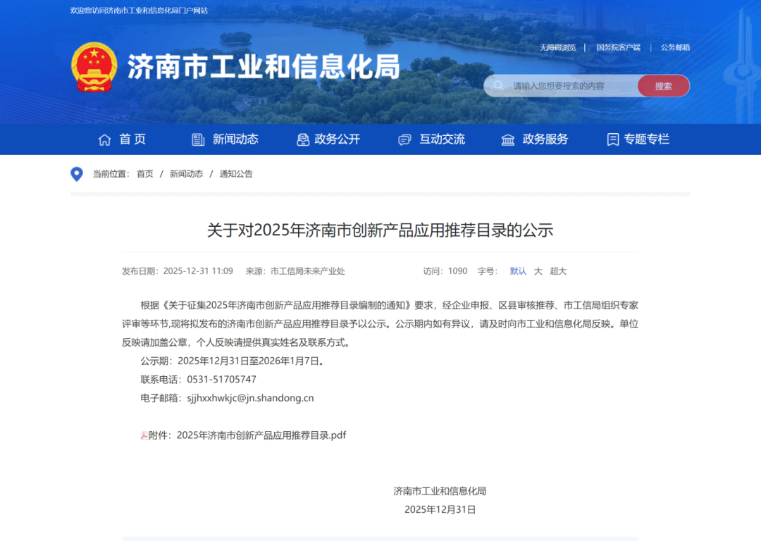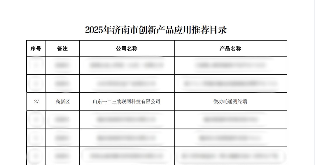 近日,济南市工业和信息化局发布2025年济南市创新产品应用推荐目录公示,山东一二三物联网科技有限公司自主研发的微功耗遥测终端成功入选!这一荣誉标志着公司在物联网技术创新与产品应用领域再获官方认可,为济南市制造业数字化、绿色化转型注入新动能。