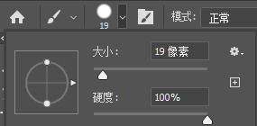 ,在工具栏属性设置画笔大小19像素,硬度100%