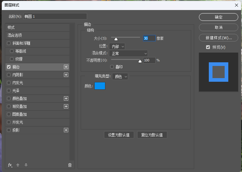,选择"描边",再打开"图层样式"设置描边样式,大小30像素,颜色(RGB:5,143,240).