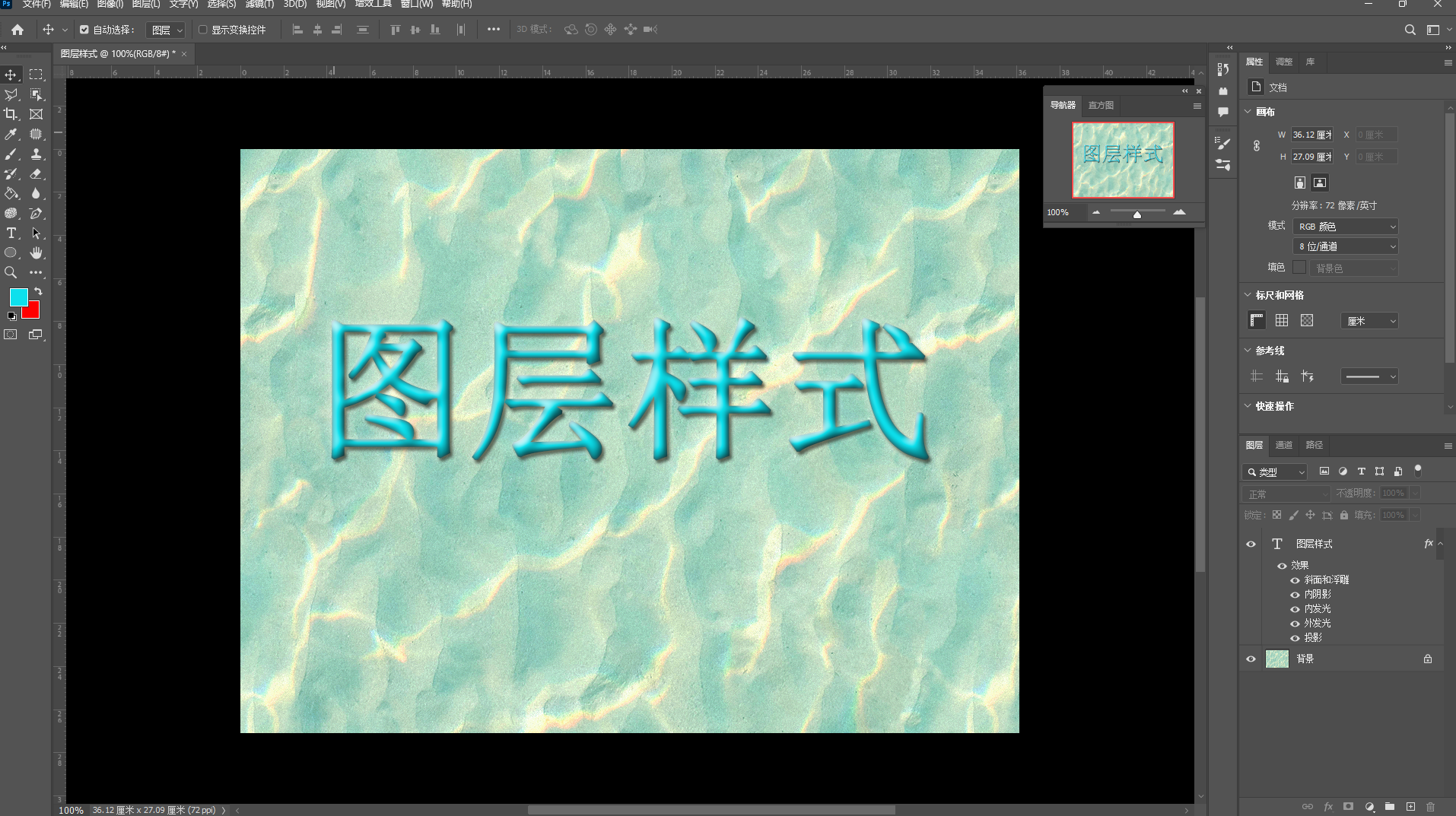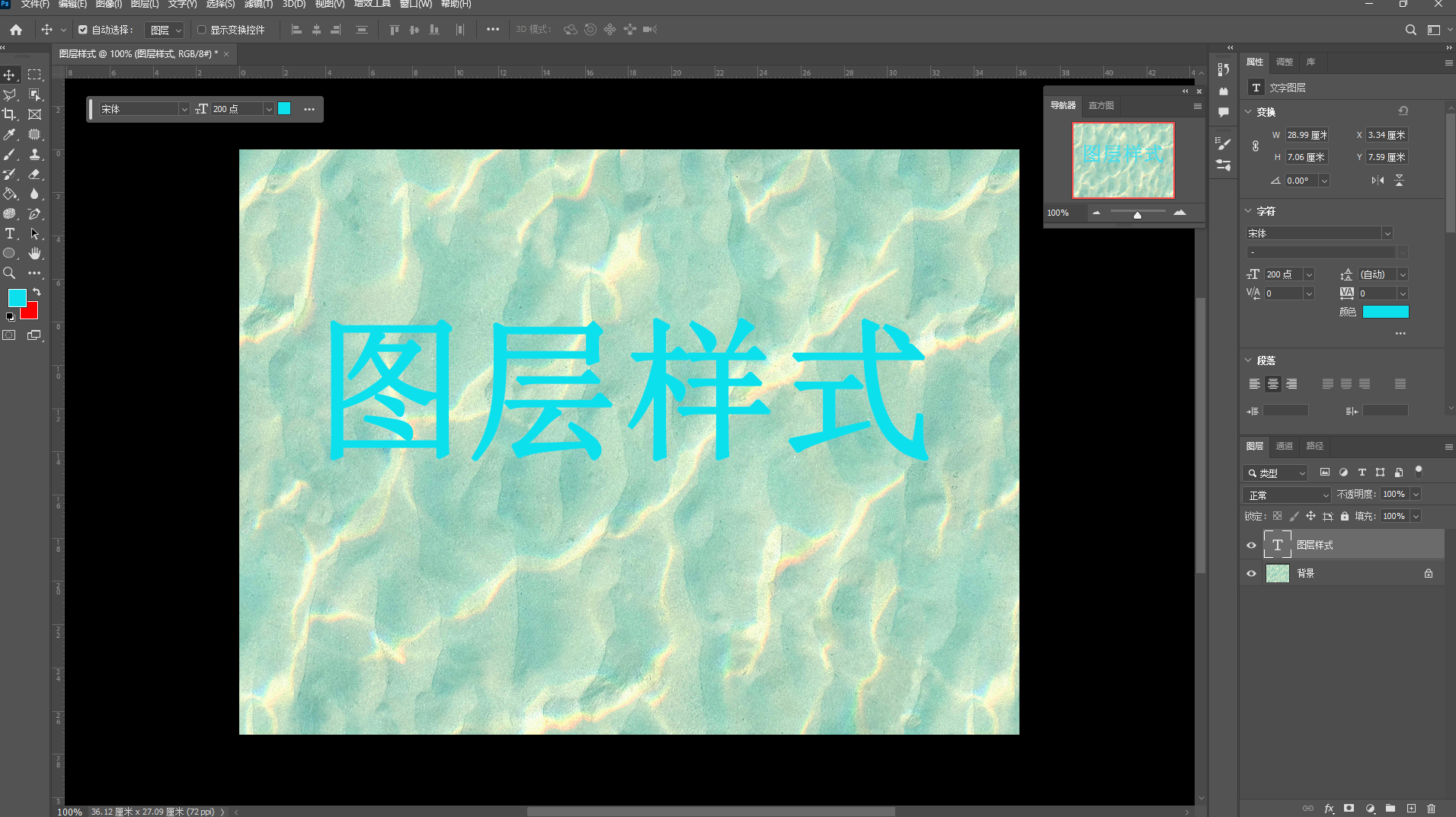 ,字体宋体,字号200像素,颜色蓝色(RGB:13,224,237),然后输入"图层样式"文字。