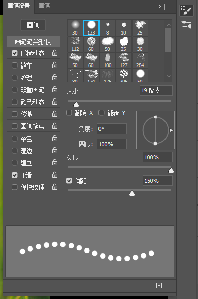 ,再打开"画笔"调板,选择"画笔笔尖形状"分类,设置"间距"为150%