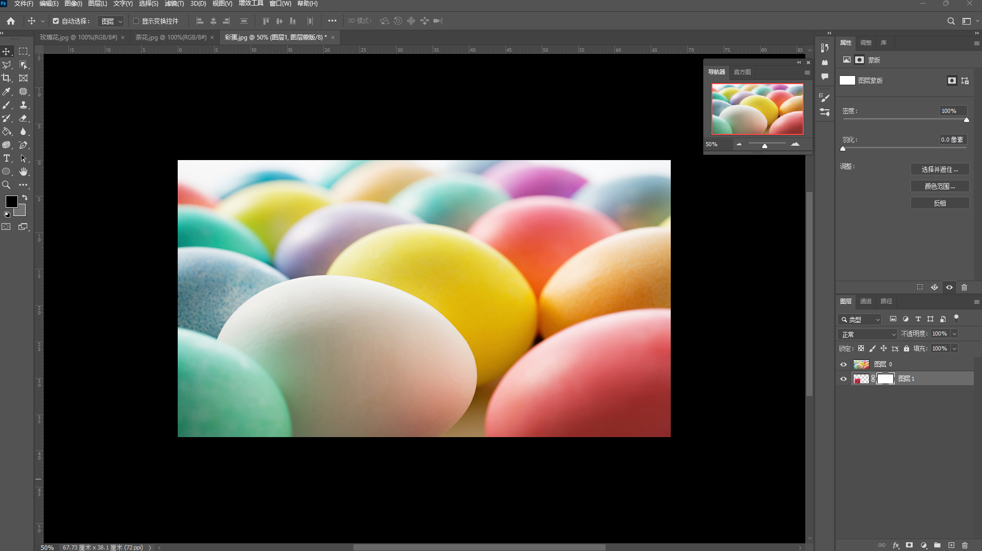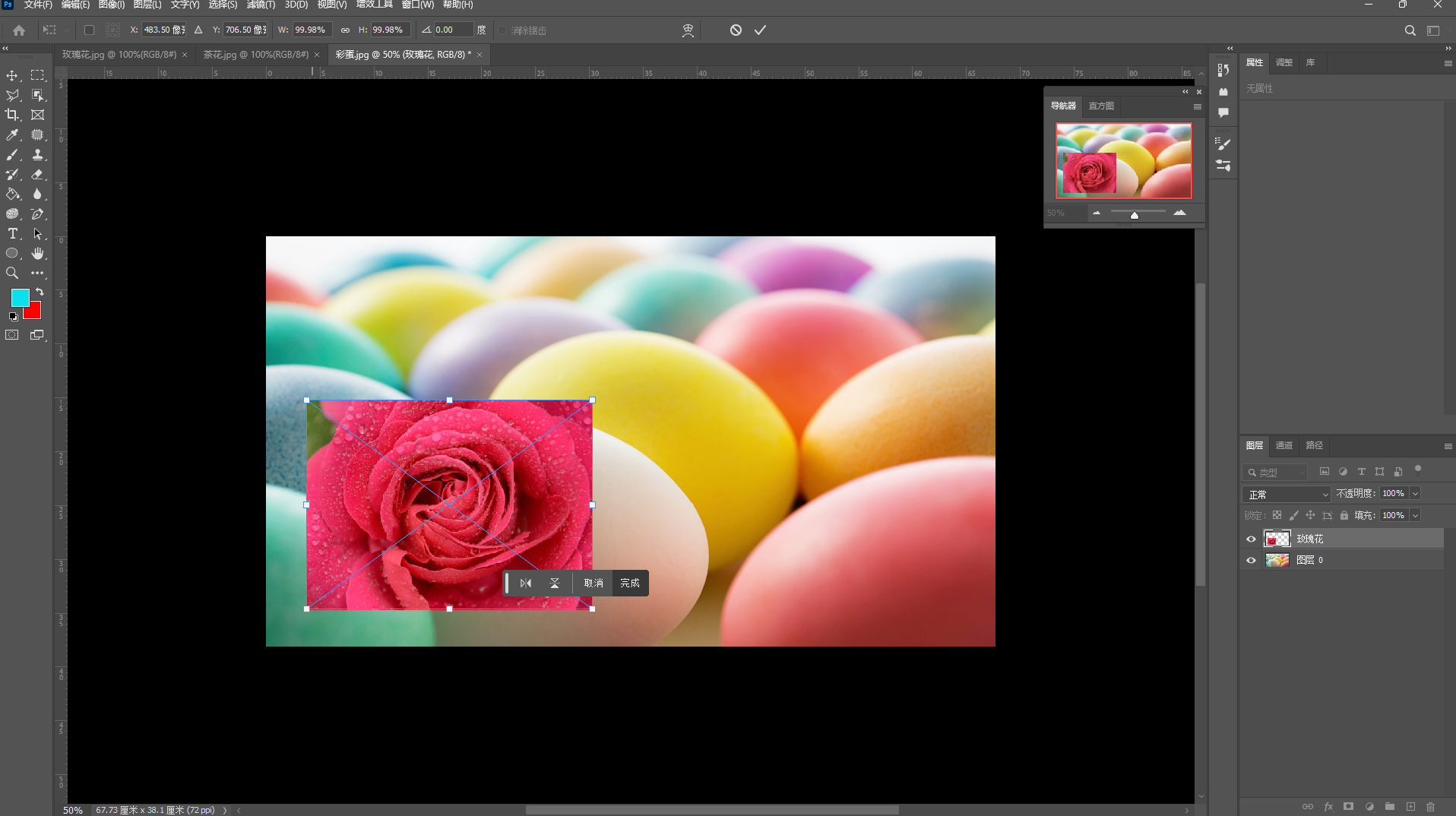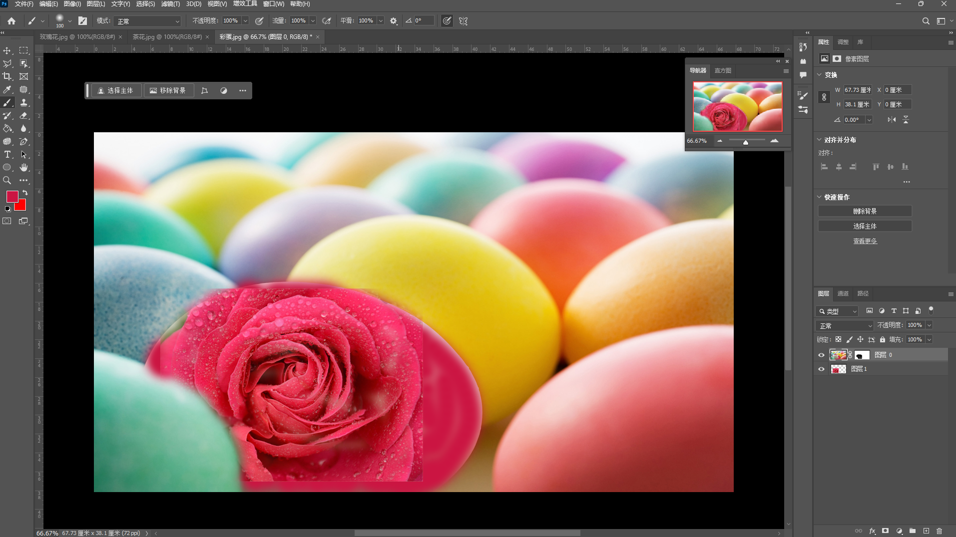 ,将背景图层转换为"图层0",然后使用"移动"工具,把"玫瑰花"图像拖到"彩蛋"图像窗口中。