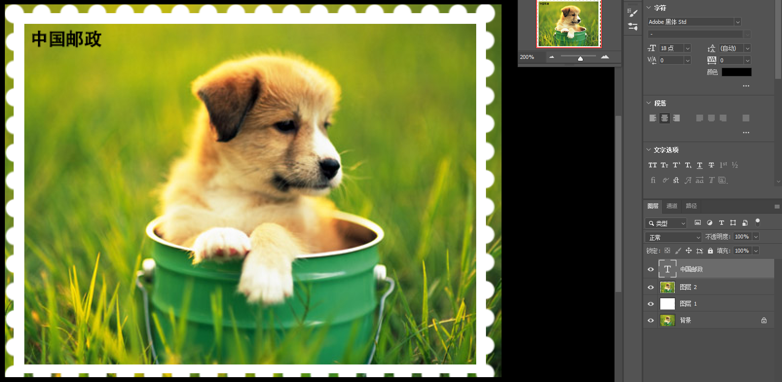 ,字体黑体,字号18,颜色黑色。在左上角打字"中国邮政",可使用移动工具