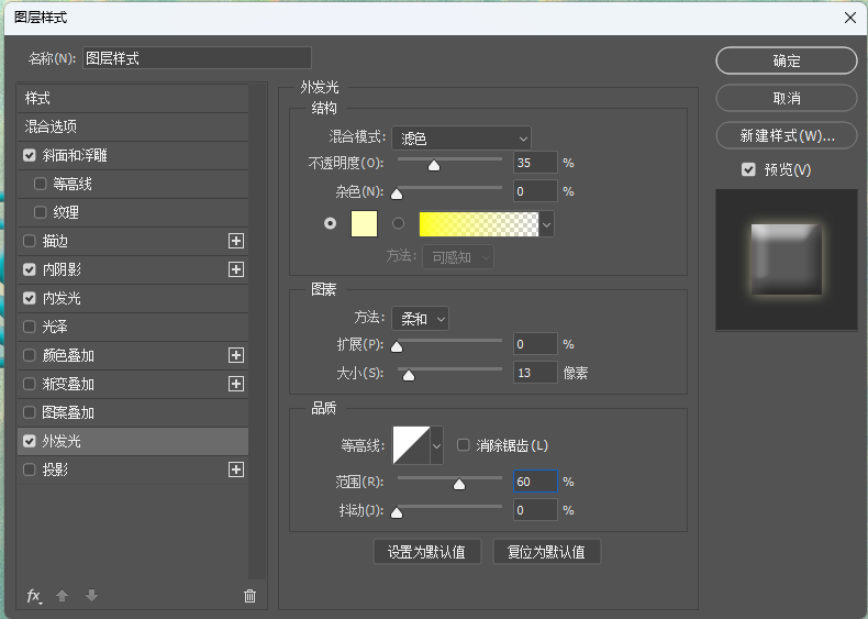 ⑤点击左侧"外发光",按照下图调整参数。发光颜色参数(RGB:255,255,190)