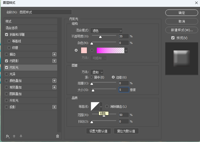 ④点击左侧"内发光",按照下图调整参数。发光颜色参数(RGB:255,204,204)