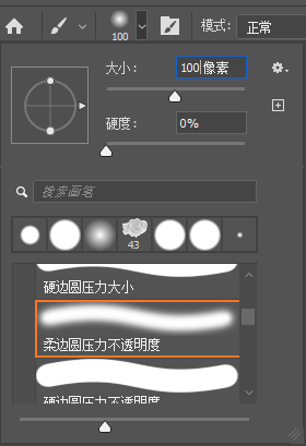 ,在工具属性栏中单击"画笔预设"旁的下三角按钮,选择"柔边圆压力不透明度"画笔,大小100像素