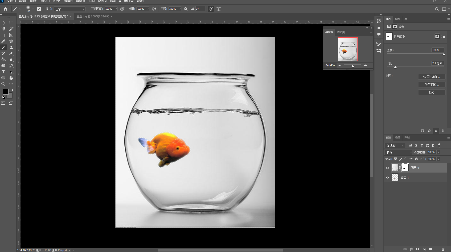 ①使用"磁性套索工具"圈出鱼本身,并且复制选区,打开"鱼缸"文件,把选区粘贴进去。【ctrl+T】调整大小到合适位置。
