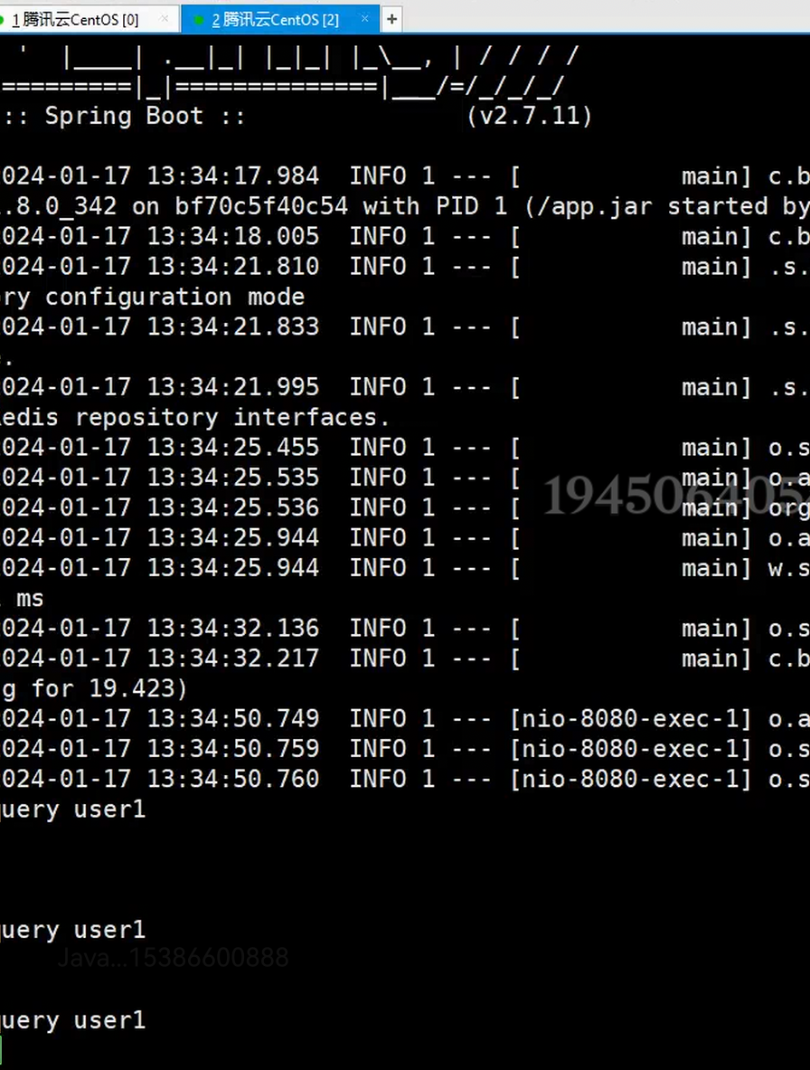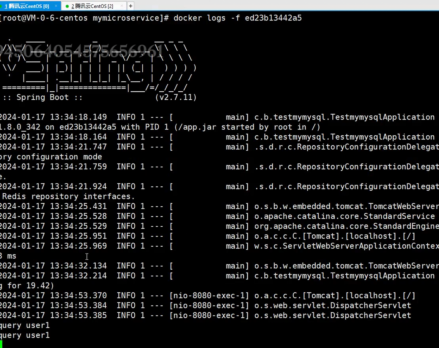 查看两个用户服务的日志,可以看到 2 个服务会轮流请求,也就是发生了负载均
