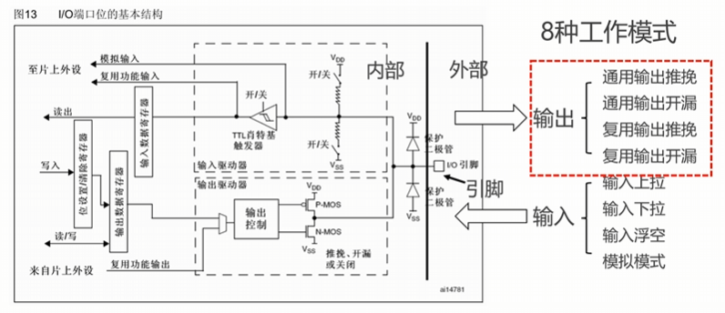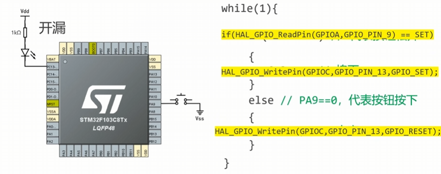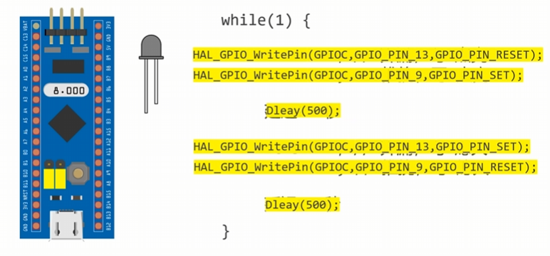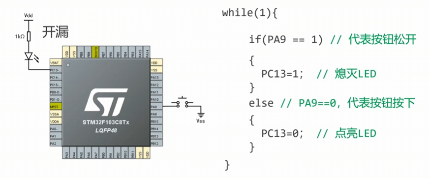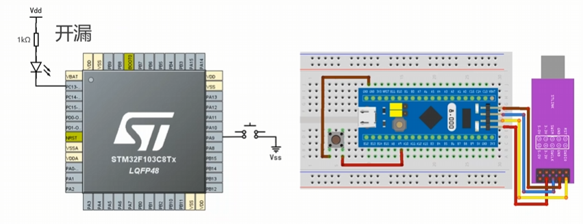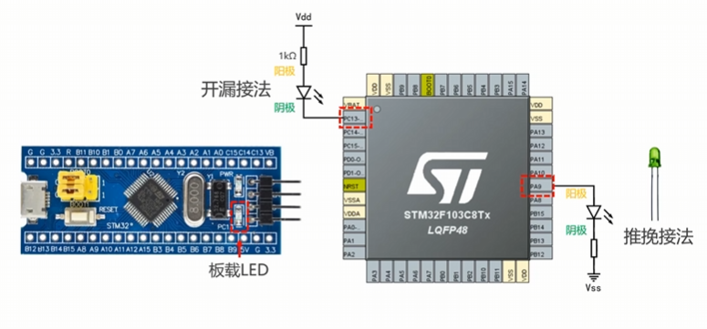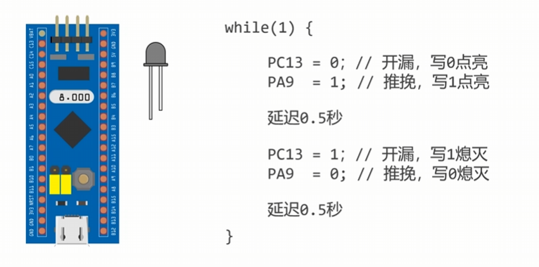 点亮板载LED在PC13引脚,它默认为开漏接法;此外,我们还可以尝试点亮一个外部LED,用推挽接法
