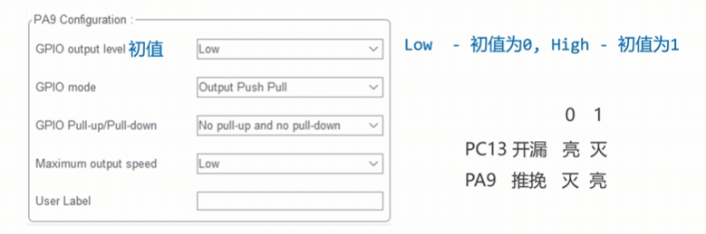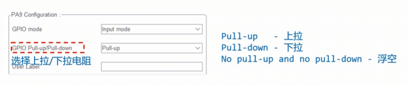 PC13的设置我们前面已经设置过,现在看一下PA9(输入GPIO_Input)的设置: