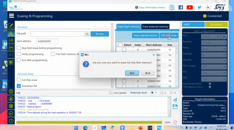 点击左侧第二个界面、完全擦除芯片、断开连接,