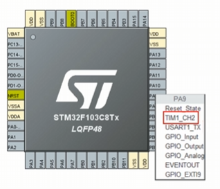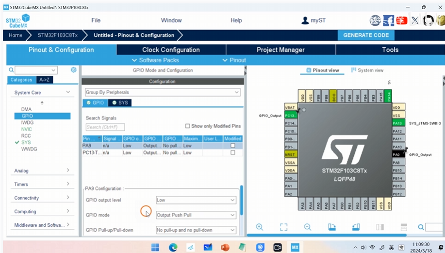 在右侧芯片图中点击PC13和PA9引脚,均设置为GPIO_Output"