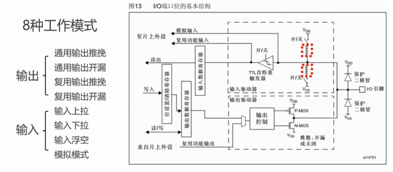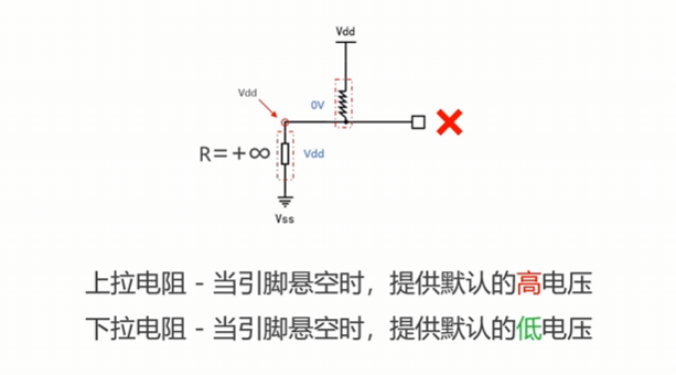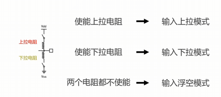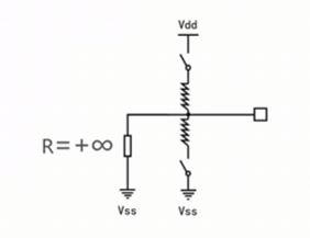 输入上/下拉模式:当没有外部输入信号,上拉电阻接通,IO引脚上也会出现一个稳定高电压,由此可得: