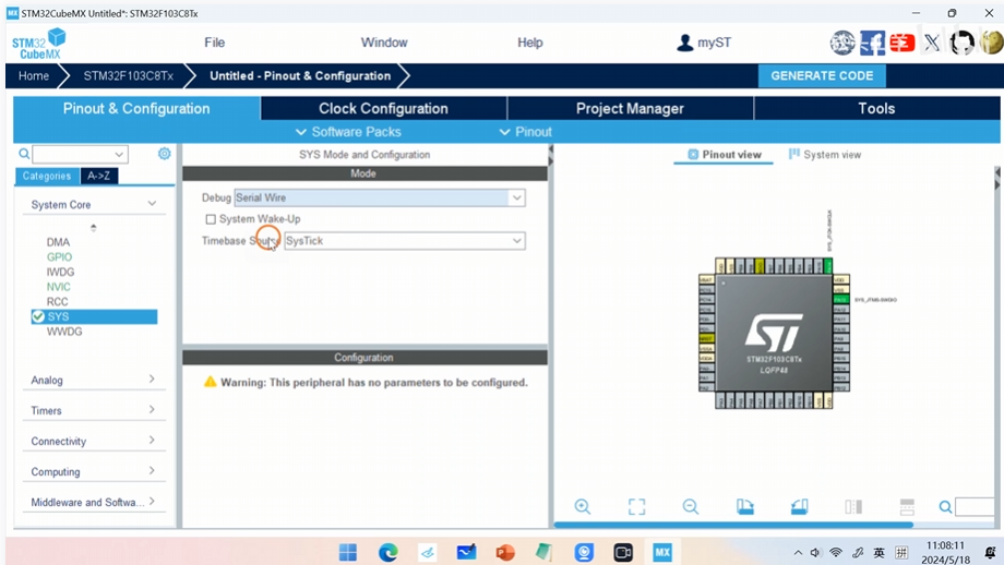 打开STM32cubeMX来看,STM32F103C8T6是这样的:
