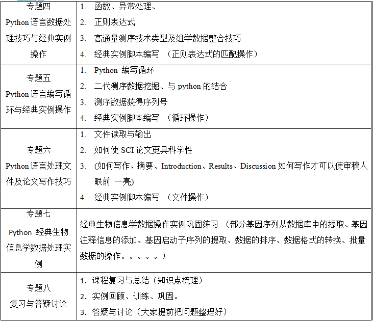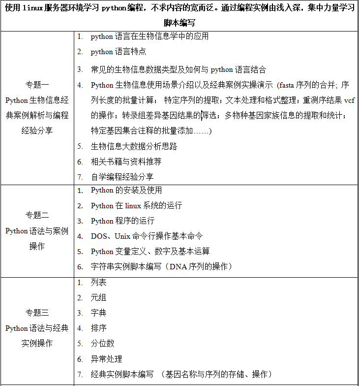 生物信息广泛涵盖基因组学、蛋白组学、系统生物学、表观遗传、非编码等前沿领域以及药物设 计、基因工程等应用领域。与传统的理论和实验学科不同,生物信息是一门数据科学,这就需要从业 者具备一定数据收集、管理、处理和分析的能力。在海量的组学数据面前,使用别人开发的软件及图 形界面操作往往不能解决工作中的问题,而简单的编程就可能解决问题,因而编程即成为一个生物信 息工作者的必备技能。本课程就是为生物信息初学者设计的编程研修班。选择 Python 作为生物信息的入门编程语言,是因为 Python 语言提供了从入门到高手的良好的学习曲线。Python 语言是至今为止最接近自然语言的编程语言,学过其它一些编程语言的学员甚至不 需要太多的训练就能读写其代码;模块化和面向对象的支持使得学员能不费力地从一个只能写几行代 码的操作员变成一个管理千行代码的程序员,同时书写良好可读性代码的编程习惯也会令其受益终 生;丰富的标准库和第三方包使得 Python 语言成为当前最好的"胶水语言",把多方资源整合到一 起来解决工作中的问题。