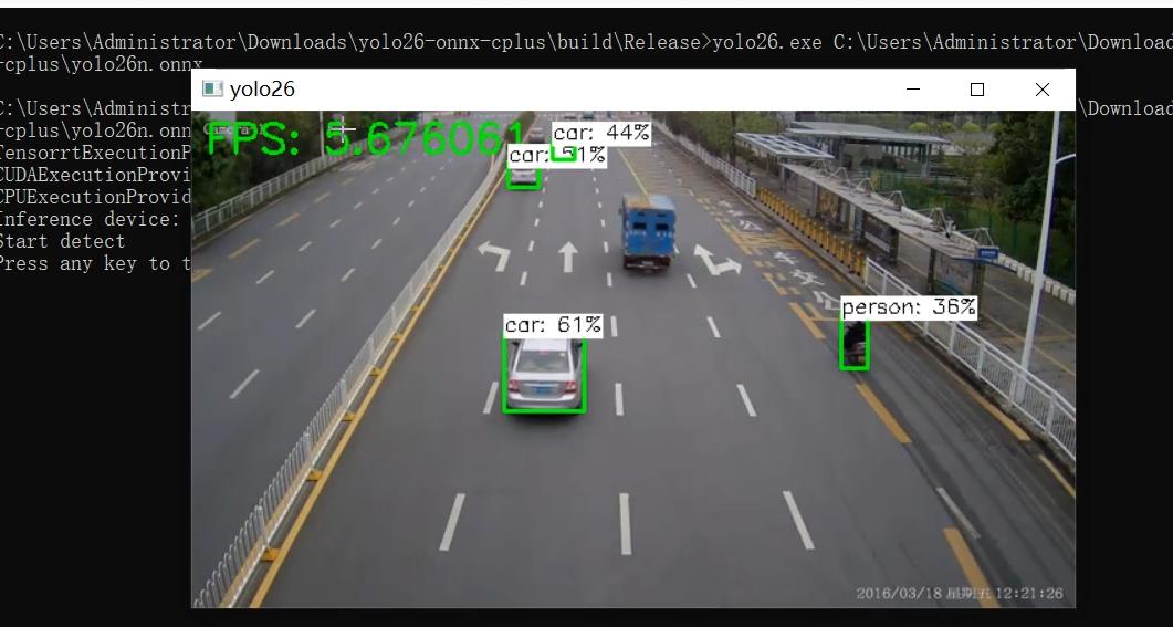 首先cmake生成exe文件,然后将onnxruntime.dll和onnxruntime_providers_shared.dll放到exe一起,不然会提示报错0x0000007b,这是因为系统目录也有个onnxruntime.dll引发冲突,并把car.mp4也放到exe一起。运行直接输入 yolo26.exe C:\Users\Administrator\Desktop\yolo26-onnx-cplus\models\yolo26n.onnx 注意onnx路径要是你真实路径我的onnx路径是我桌面上地址