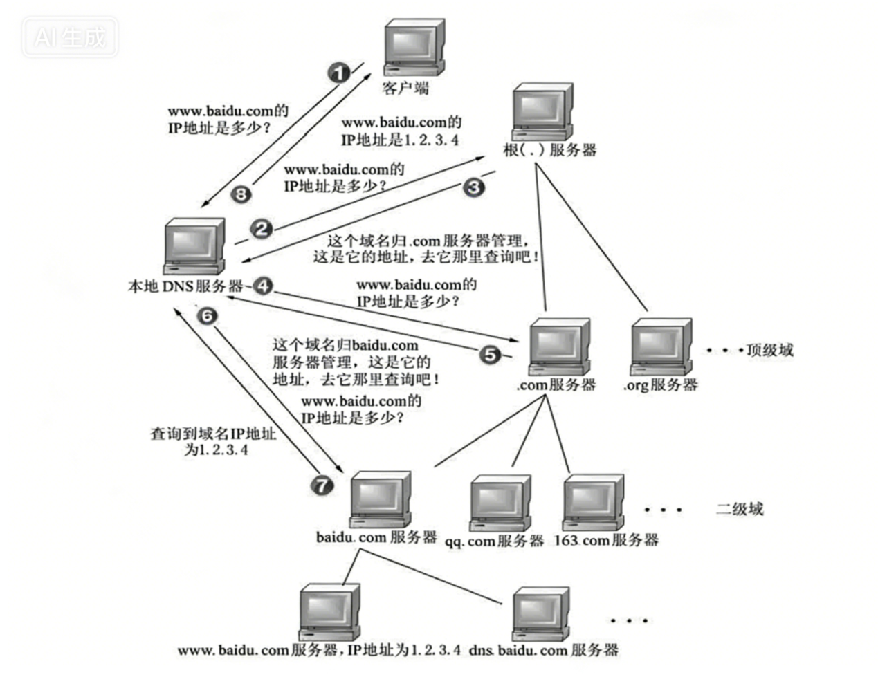 递归查询本地 DNS :若本地无缓存,客户端向本地 DNS 服务器发送 "递归查询请求"("帮我找到www.baidu.com的 IP");