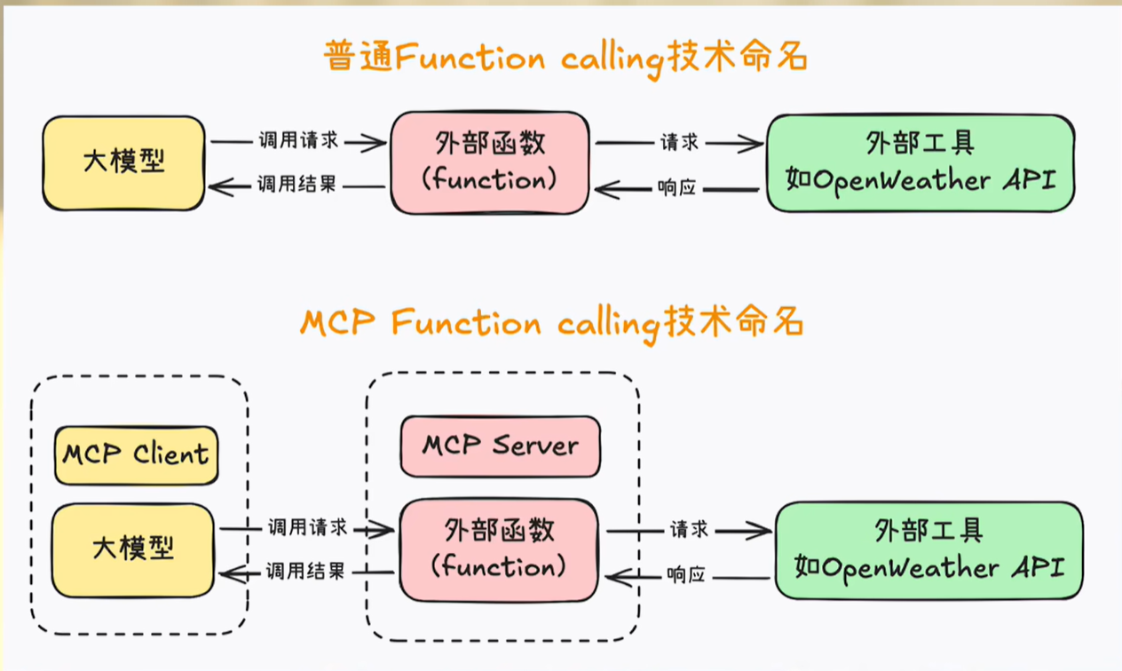 - Function calling解决的是大模型与AI应用程序之间的对话问题。它的工作是传递给大模型一个工具清单,然后模型返回一个文本格式的调用指令。Function call只负责告诉大模型有哪些工具,不关心这些工具在哪里,怎么调用。