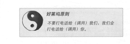 有了好莱坞原则,我们允许低层组件把自己挂钩进系统,但由高层组件决定何时需要它们,以及怎样需要它们。换句话说,高层组件对低层组件的态度是"不要打电话给我,我们会打电话给你。"