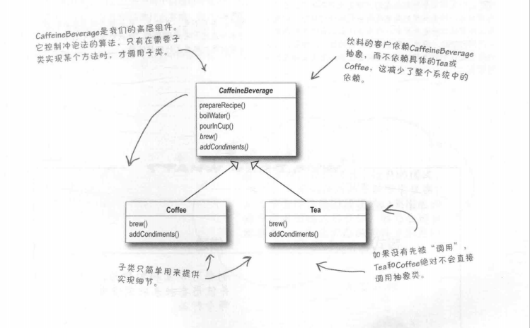 好莱坞原则和模版方法模式之间的关系可能还是相当明显的:当我们用模版方法模式设计时,我们在告诉子类,"不要打电话给我,我们会打电话给你。"怎么做?我们再看看CaffeineBeverage的设计: