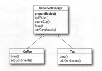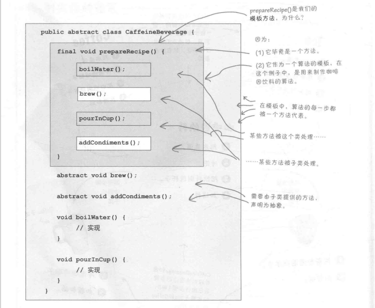 我们实现了模版方法模式。模版方法模式是什么,我们来看看CaffeineBeverage类的结构,它包含实际的"模版方法":