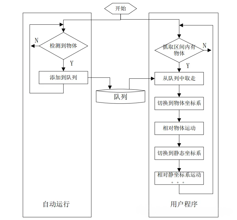 动态跟随抓取并非简单的串行步骤,而是一个高度协同、并行处理的精密闭环。其工作流程可清晰地分为检测与跟随运动两大并行的线程,它们通过共享的数据队列进行无缝衔接。