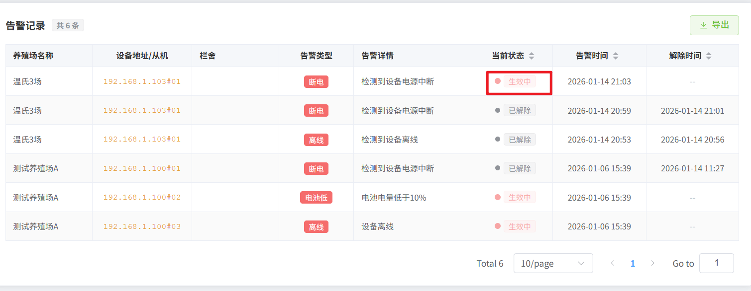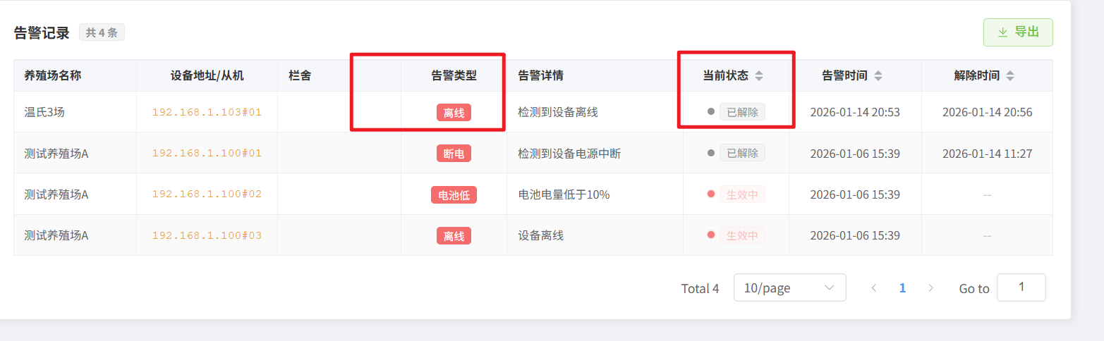 - 在线状态异常:从机未在 "读取频率" 时间内上报数据(如读取频率 60 分钟,从机超过 60 分钟无数据),系统判定 "离线",生成 "离线告警" 并关联该从机;