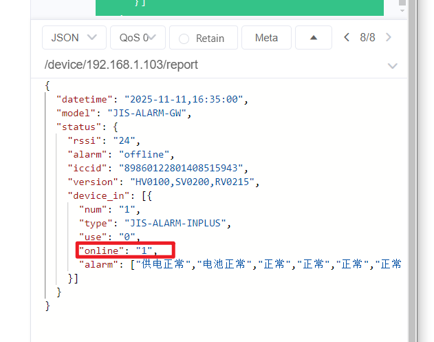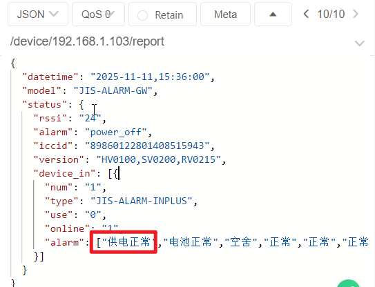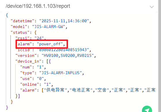 核心修改:status 中的 alarm 改为 power_off,device_in 的 alarm 数组第一个元素改为 "供电异常"