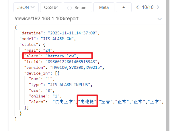 核心修改:status 中的 alarm 改为 battery_low,device_in 的 alarm 数组第二个元素改为 "电池低"