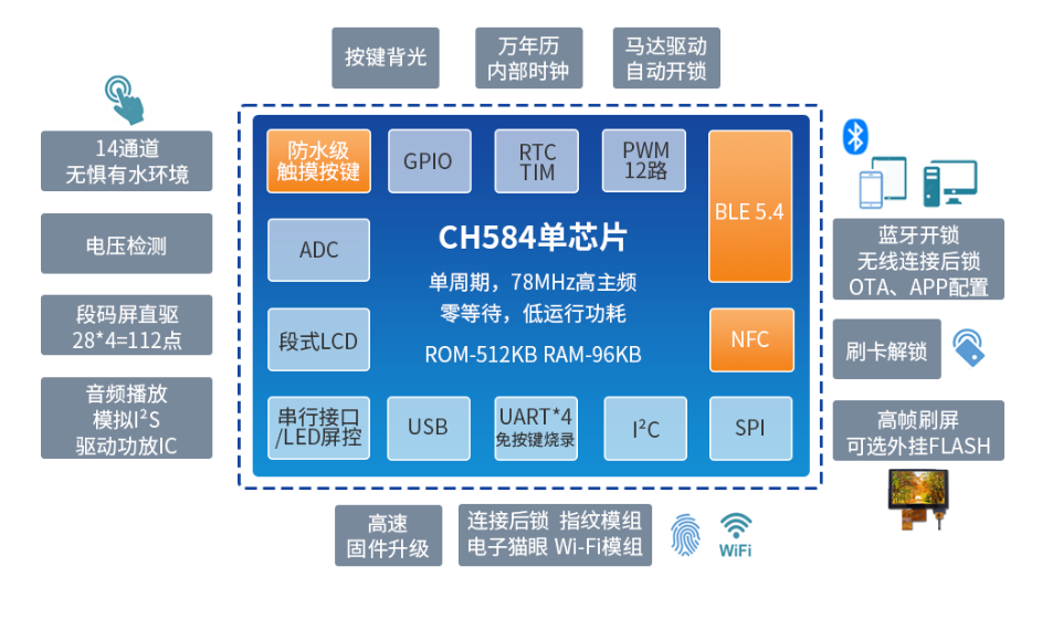 英尚经销的CH584芯片作为一款专为智能门锁设计的高集成度低功耗芯片,集成了多类无线通信与人机交互接口,大幅简化了硬件设计,提升了系统稳定性与能效表现。