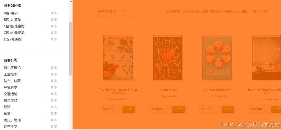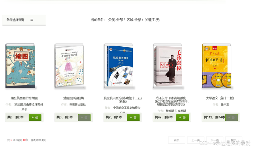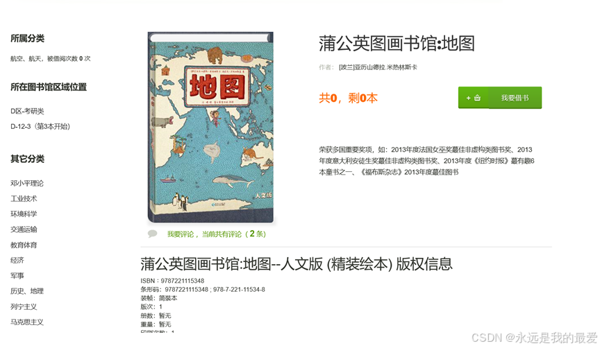 借书模块主要是可以是用户通过借书分类、图书馆区域、书名、作者、等快速检索的列表;用户点击检索到的图书,点击查看详情可以跳转到详情页面,同时详情页面对于已借阅过的书籍可以进行评论;除此之外,还可以添加到自己的书架进行收藏,方便下次快速进行找到自己想找到的书籍;设计效果如下图所示: