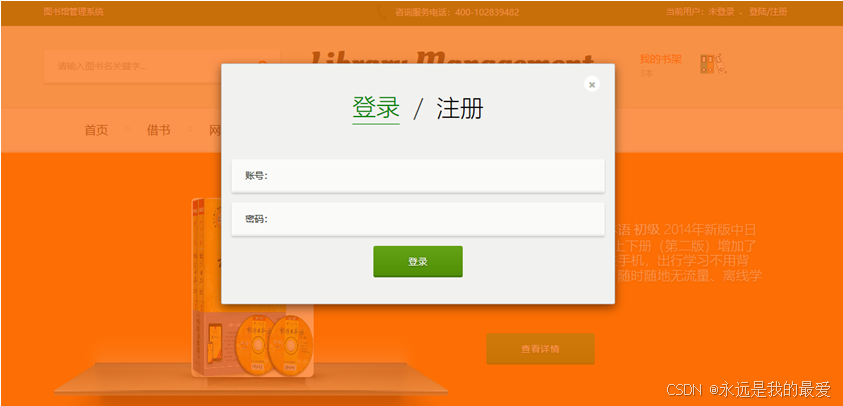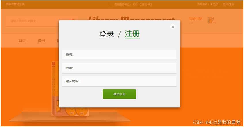 当浏览者没有注册成为会员的时候,点击加入我的书架的时候,会提示请先登录。那么此时用户就会跳转到登录页面,而没有账号的浏览者可以点击注册按钮再跳转到注册页面,输入帐号、密码、确认密码进行注册;注册成功后,再进入登录页面输入帐号和密码进行登录;如下图所示: