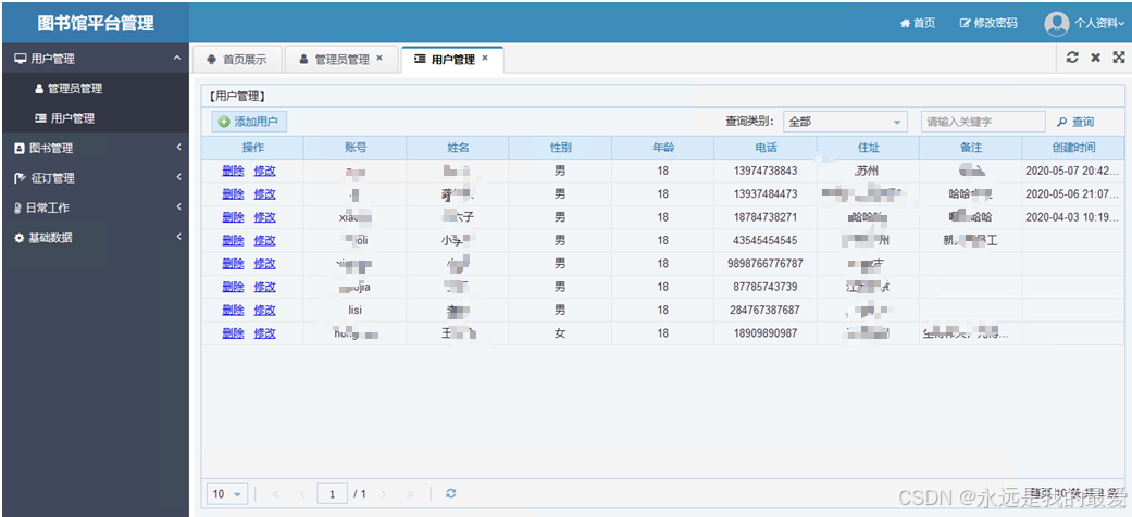 用户管理主要是通过管理员或注册的用户信息进行查询、修改、删除等操作,设计效果如下图所示: