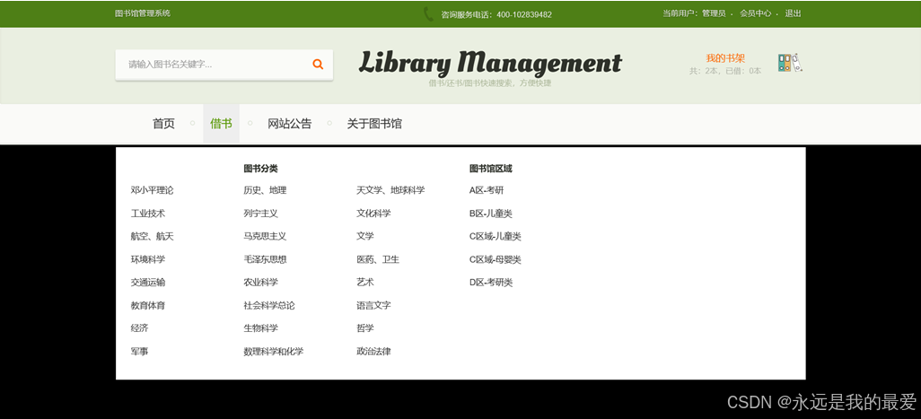 网站系统的运行和维护是由系统后台管理和维护的,系统管理员则是负责管理维护系统后台的。本文系统后台管理主要由用户管理(管理员管理和会员管理)、图书管理(图书分类和图书维护)、征订管理、日常工作(归还处理、借阅处理、缴纳罚金、缴纳押金)、基础数据(公告列表和图书馆区域管理)。