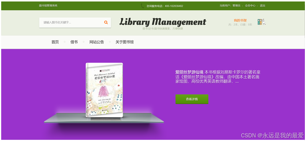 网站首页主要包含了本系统主要功能模块比较有价值的功能比如:最新推荐的书籍通过Banner图片滚动的方式进行突出展现给用户、整个网站的主要操作说明模块展现如:借书、还书、缴纳罚款等提示、新书推荐、最新的书评以及最新的公告等信息的呈现;设计效果图如下图所示: