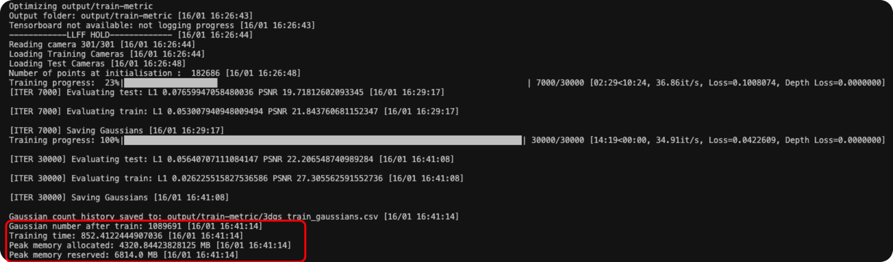 | 3DGS | Train | 852.4s | 1089691 | 6.814 GB | 133.9 | 22.178 | 0.821 | 0.195 |