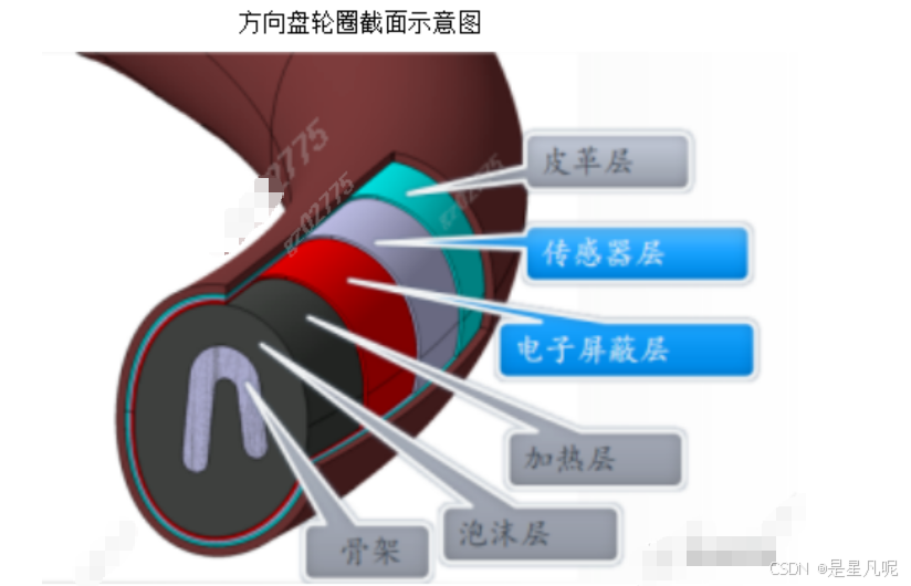 电容感应式方向盘的结构由外包裹层、双区电容感应衬垫、绝缘层、 PU 加热层、内部发泡材料和骨架组成。它通过探测指尖的微电流就可以感知驾驶员的操作意图。