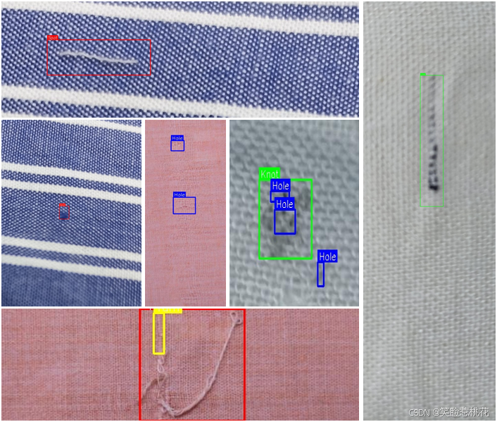 数据集有四类标签,分别为 破洞(Hole)、污点(Spot)、结头(Knot)、纱线(Yarn)。