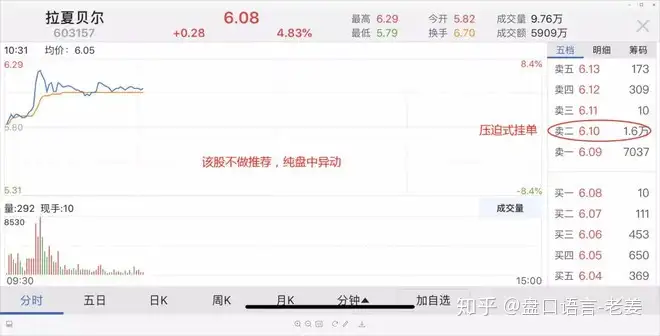 因为此时的压单并不一定是有人在抛空,有可能是主力自己的筹码。主力在造量,在吸引投资者注意。如果持续出现卖单挂出就被吃掉,那可反映出主力的实力。但大家要注意,如果想介入,千万不要跟风追买卖盘。等待大抛单不见了,股价在盘中回调时再介入,避免当日追高被套。