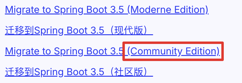 参考官方文档:Spring-Boot-4.0-Migration-Guide,Spring4.0升级指南,其中提到,建议先升级到3.5.x,然后再升级到4.0,因此我们按照这个方案(对于生产项目,遵循Spring官方建议(先3.5,再4.0)是更稳妥、风险更低的选择。测试项目,应该可以直接使用下面的升级到4.0)