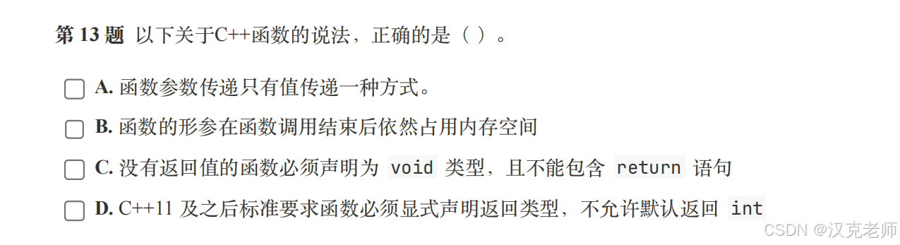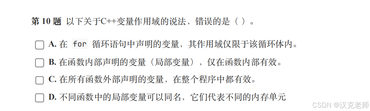 选项C的说法不严谨 。在C++中,全局变量 (在所有函数外部声明的变量)默认具有全局作用域 ,但若使用static关键字修饰(如static int x;),则其作用域会被限制在当前源文件内,而非整个程序。