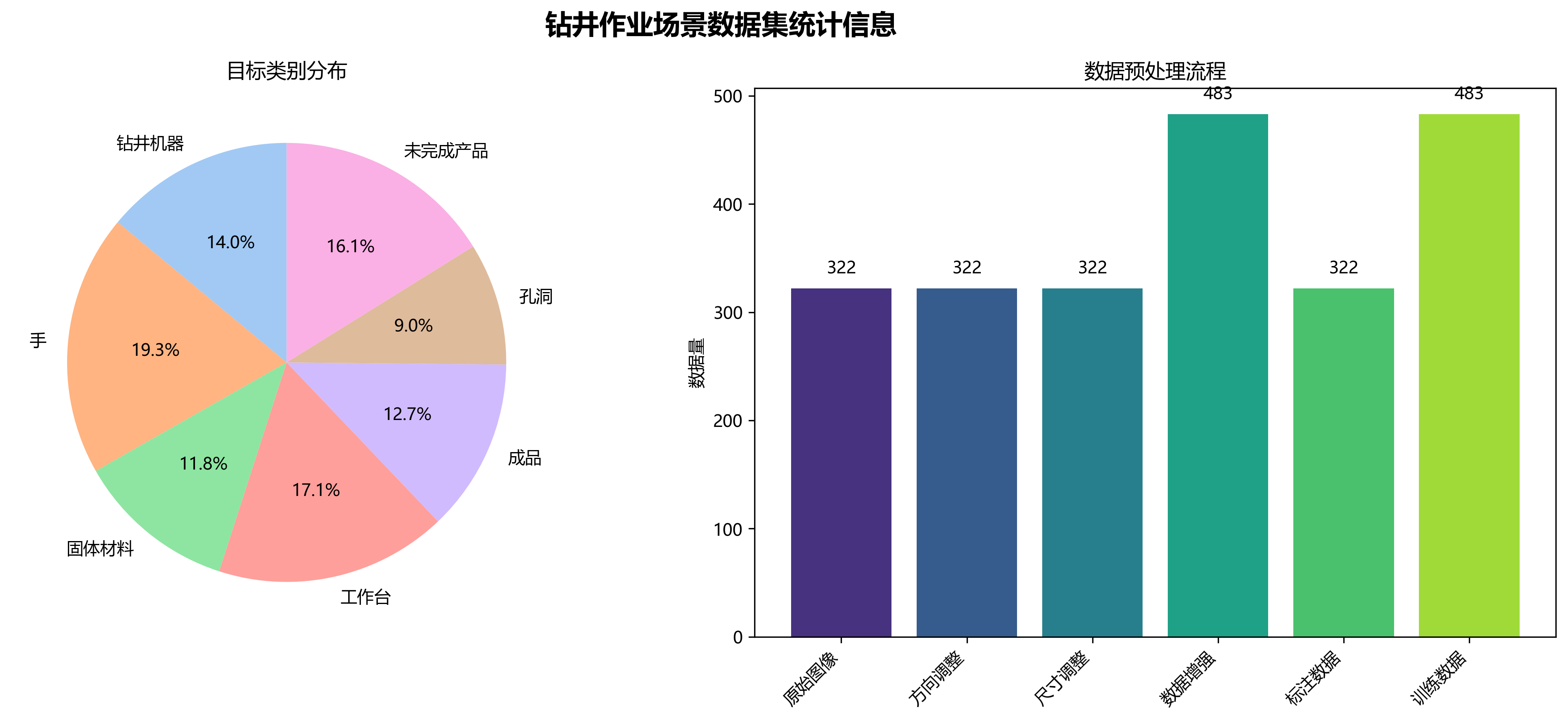 该数据集专注于钻井作业场景的计算机视觉任务,包含322张经过预处理的图像,采用YOLOv8格式进行标注。数据集提供了七类目标对象的标注,包括钻井机器(Drilling Machine)、手(Hand)、固体材料(Solid)、工作台(Table)、成品(finish product)、孔洞(holes)以及未完成产品(unfinish product)。每张图像均经过自动方向调整、拉伸至640x640像素的预处理步骤,并应用了数据增强技术,包括50%概率的水平翻转、-15至+15度的随机旋转、-15%至+15%的随机亮度调整以及-10%至+10%的随机曝光调整,以扩充训练样本的多样性。该数据集采用CC BY 4.0许可协议,适用于目标检测模型的训练与评估,特别是在工业自动化、质量控制和生产流程监控等应用场景中具有重要的实用价值。