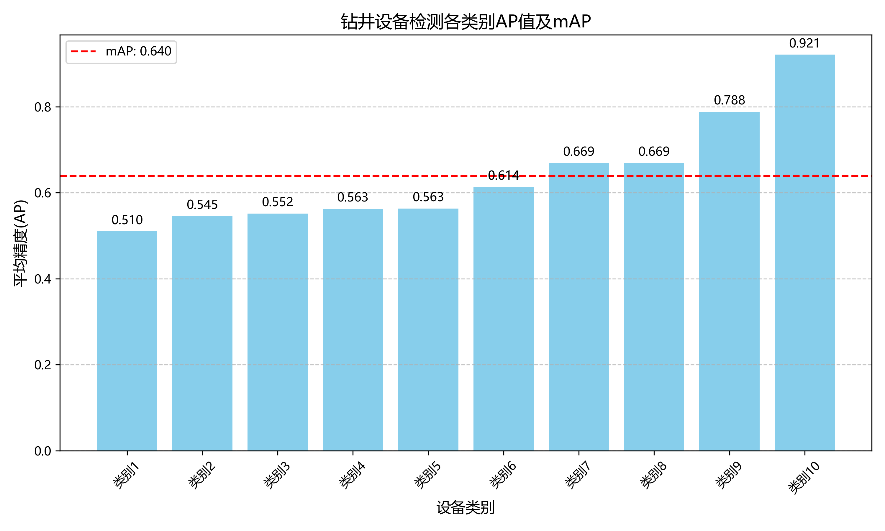 其中,n为类别总数,AP_i为第i类别的平均精度。mAP是目标检测领域最常用的评价指标,能够全面反映模型在所有类别上的检测性能。在钻井设备检测中,mAP可以评估模型对所有类型设备的检测能力。