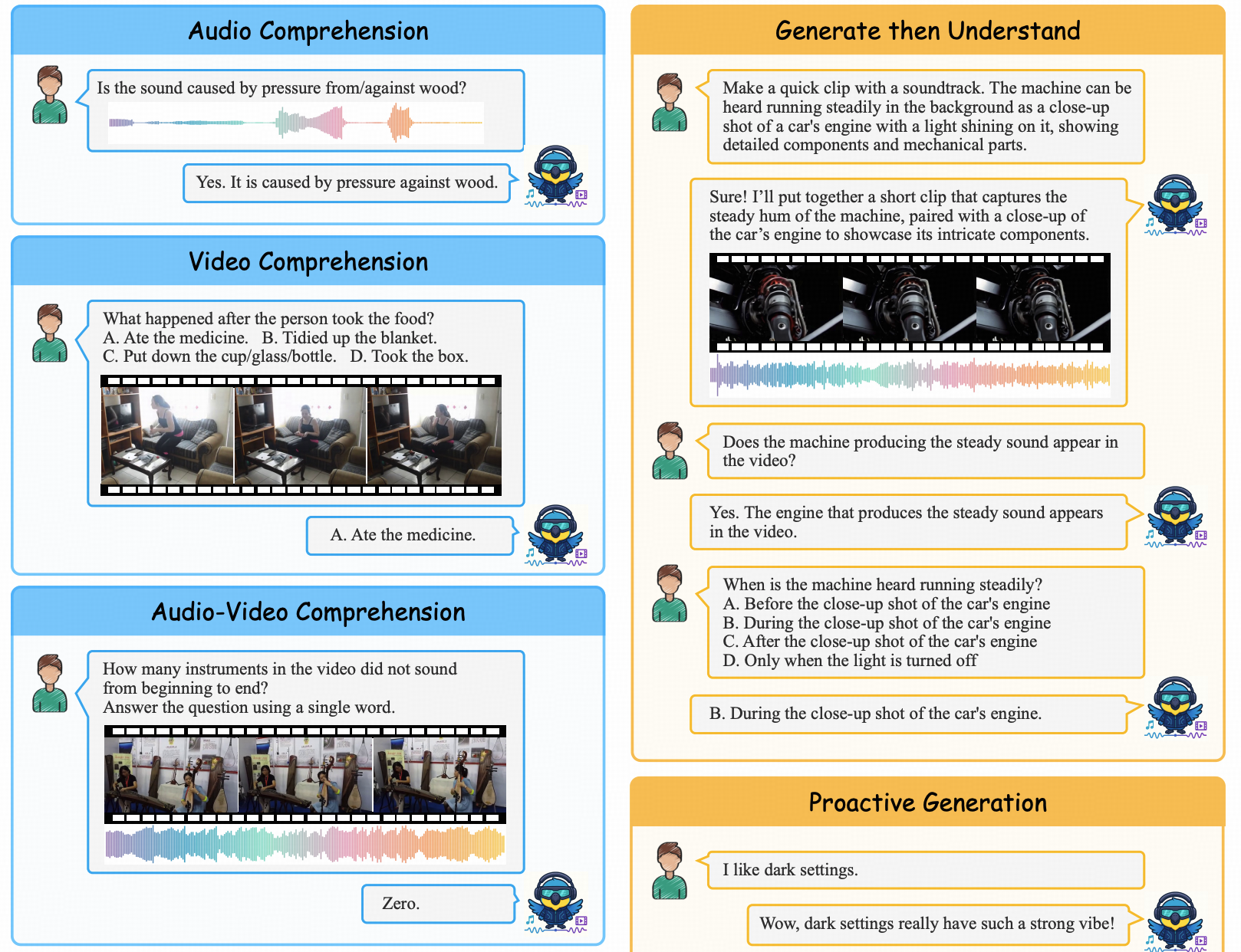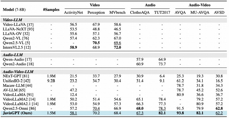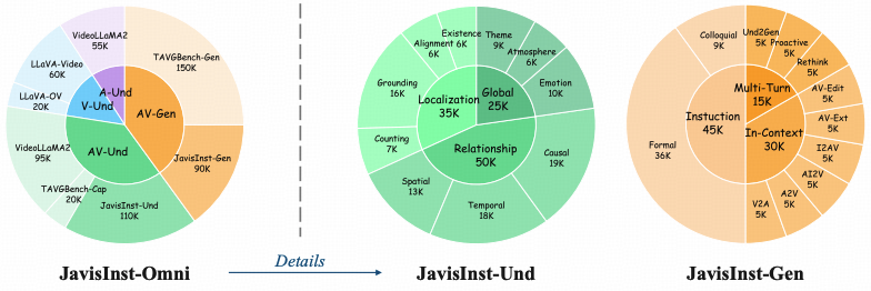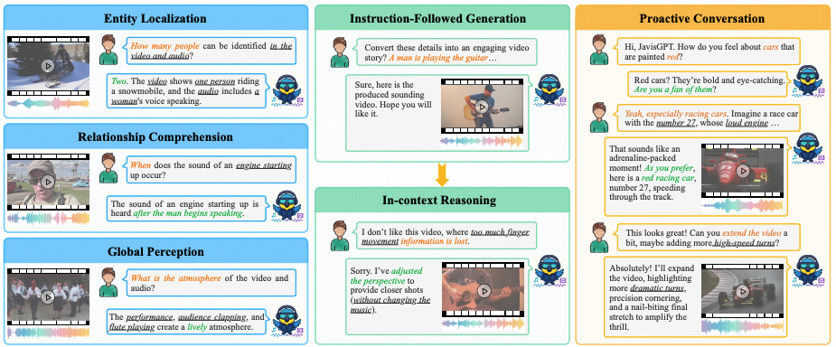- 大规模指令微调: 引入JavisInst-Omni数据集,激发模型遵循复杂人类指令进行推理和交互的能力。